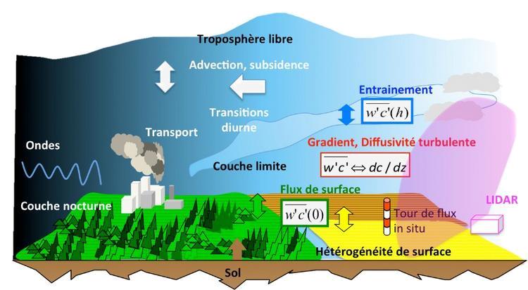 Les lidar TERA (température) et COWI (vitesse, HO2 et/ou CO2) et MOBILIS (aérosols) permettent de combiner mesures simultanées de vitesse et de scalaires et donc d’effectuer des mesures de flux en utilisant des méthodes de corrélation turbulente ou de gradient [Gibert JGR, 2007 ; Gibert JTECH, 2011]. A terme, une restitution des champs de vitesse et de concentration 3D sera possible expérimentalement et pourra être comparée aux résultats de simulations LES. Un lien pourra être effectué entre les processus dynamiques de petite échelle (turbulence coefficient de diffusivité) et leurs causes/effets à moyenne échelle (hauteur de couche limite, jets, ondes).