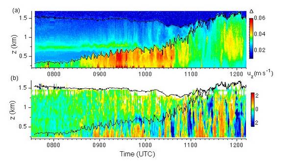 Un exemple d’étude de la transition du matin et de synergie instrumentale MOBILIS-COWI est donné ci-dessous. La convection dans la couche limite force la formation d’ondes de gravité dans la couche résiduelle, identifiées par les fluctuations de la vitesse verticale de l’air et de la polarisation de la lumière laser rétro-diffusée par les particules dans l’atmosphère [Gibert QJRMS 2011].