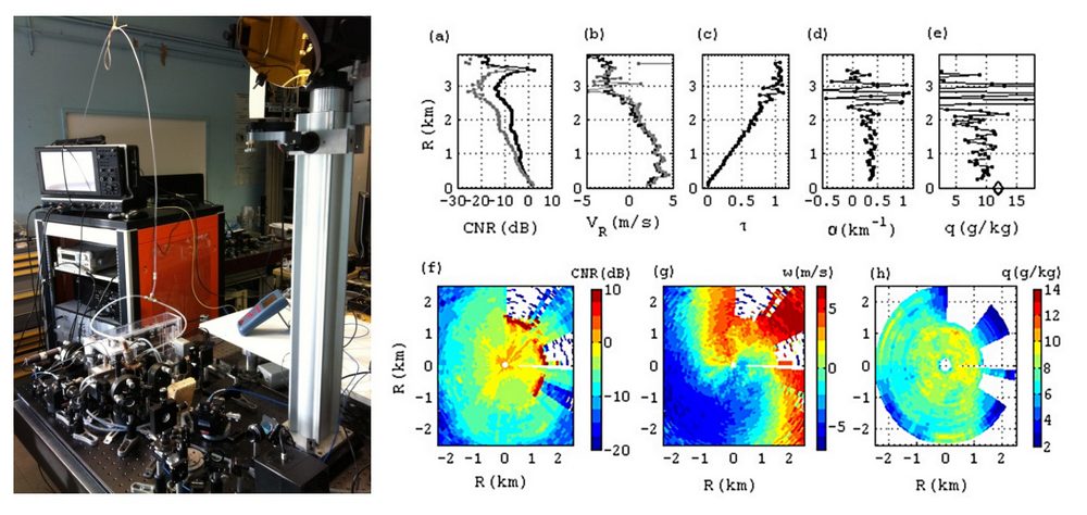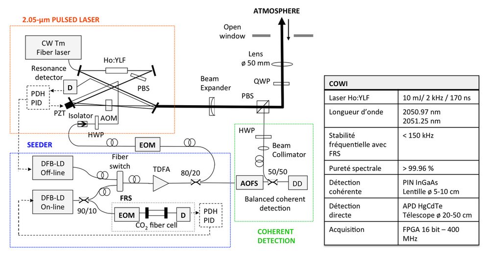 Le lidar COWI repose sur une source laser innovante brevetée réalisée au laboratoire [Gibert Brevet 2013 ; APB, 2014 ; OL, 2015]. Le laser est constitué par un cristal dopé Holmium pompé par un laser Thulium fibré pour une émission dans le proche infrarouge à 2 µm. La cavité est injectée, déclenchée et permet de délivrer des impulsions de durée 50 ns, d’énergie 10 mJ à une cadence de 2 kHz. Le laser délivre en fait des impulsions à deux longueurs d’onde, l’une centrée sur une raie d’absorption du gaz sondé, l’autre en dehors pour servir de référence. Le système utilise une détection cohérente. La plus grande partie de l’instrument est fibrée. Dans le domaine spectral considéré des raies d’absorption de CO2 et H2O permettent des mesures DIAL de l’absorption des deux composés avec le même système lidar.
