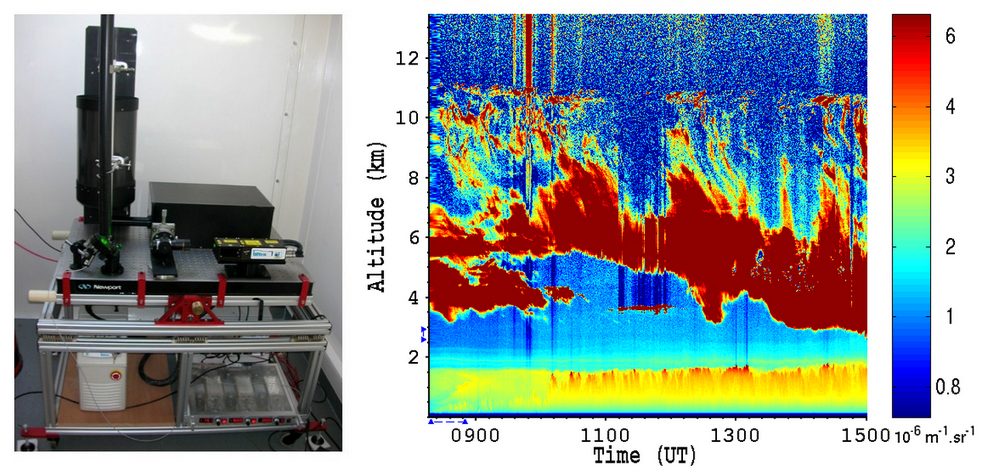 Le LIDAR permet d’obtenir des profils de rétrodiffusion à 1064, 532 et 355 nm et la dépolarisation à 355 nm avec une résolution spatiale et temporelle d’environ 15 m et 1 min . Une voie raman N2 à 387 nm permet d’obtenir le coefficient d’extinction particulaire à 355 nm avec une résolution spatiale de 100 m et temporelle de 1 h environ pendant la nuit
